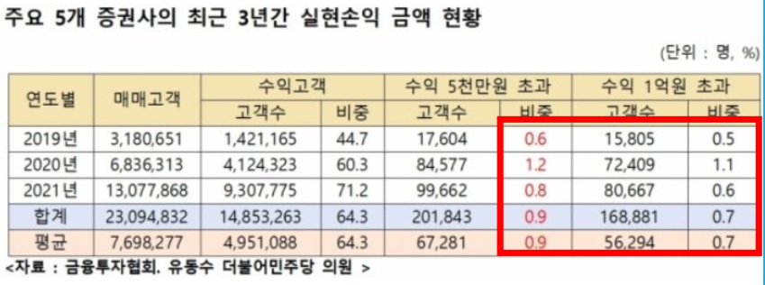 위 표를 보면 5천만 원 까지는 공제가 되기 때문에 5천만 원 이상 수익을 올려 과세대상이 되는 투자자는 1% 내외 이기
